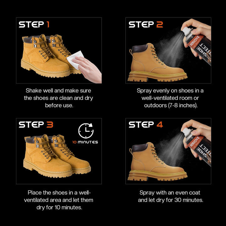 - Easy Application,Quick Results: Our shoe spray is designed for convenience. First clean and dry the surface of the shoe. Spray evenly from 7-8 inches away from the surface. Let it sit for 10 minutes. Repeat the spray and let it sit for 30 minutes to achieve a deep waterproof effect.