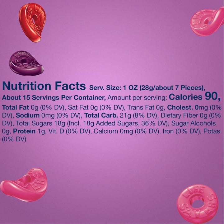 Details: Enjoy the classic taste of LIFE SAVERS candy as a chewy and fruity gummy candy. LIFE SAVERS Wild Berries gummy candy features a mix of strawberry, red raspberry, blackberry, black raspberry, white grape, and cherry berry fruit flavors. Who could resist the simple joy of the soft, chewy, fruity goodness of LIFE SAVERS gummy candy? Who would want to? Each chewy candy pack contains enough candy pieces to share or enjoy on your own! Keep a pack of LIFE SAVERS gummies at your desk for whenever you need a fun candy break. Brighten up small celebrations and every day moments with fruity LIFE SAVERS candy. LIFE SAVERS gummy candy packs are great for taking on the go. Pack them in lunches or take them along on family road trips. Share tasty fun with friends and family when you break out LIFE SAVERS Gummies. These gummy packs make great stocking stuffer candy gifts and Easter basket candy. Sweeten up your movie candy spreads and game day snack tables with LIFE SAVERS gummy candy. Your favorite berry flavors are always in season with LIFE SAVERS Gummies Wild Berries candy.
